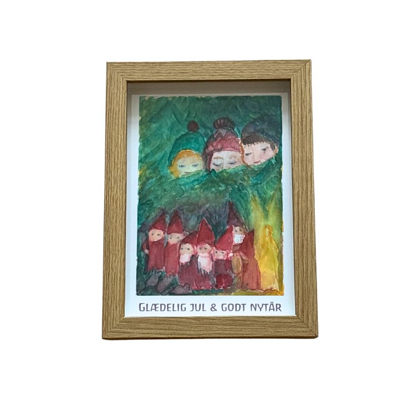 Et stemningsfuldt decembermotiv af Tine Barfoed, trykt som postkort med teksten “Glædelig jul & godt nytår”. Leveres indrammet – klar til at pynte på bordet, hænge på væggen eller gives som en personlig julehilsen.